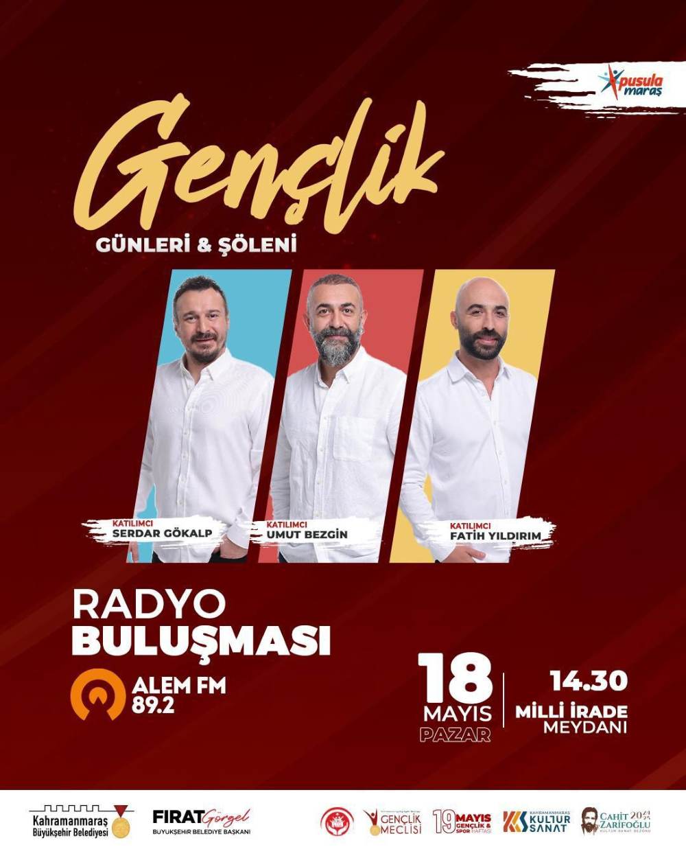 18 Mayıs Pazar günü ise programlar Milli İrade Meydanı’na taşınacak. Saat 14.30’da başlayacak etkinlikte, Alem FM’in sevilen radyo programcıları Serdar Gökalp, Umut Bezgin ve Fatih Yıldırım, gençlerle samimi bir söyleşide buluşacak. Mizah ve radyo deneyimleri eşliğinde gerçekleşecek bu buluşma, eğlenceli anlara sahne olacak.