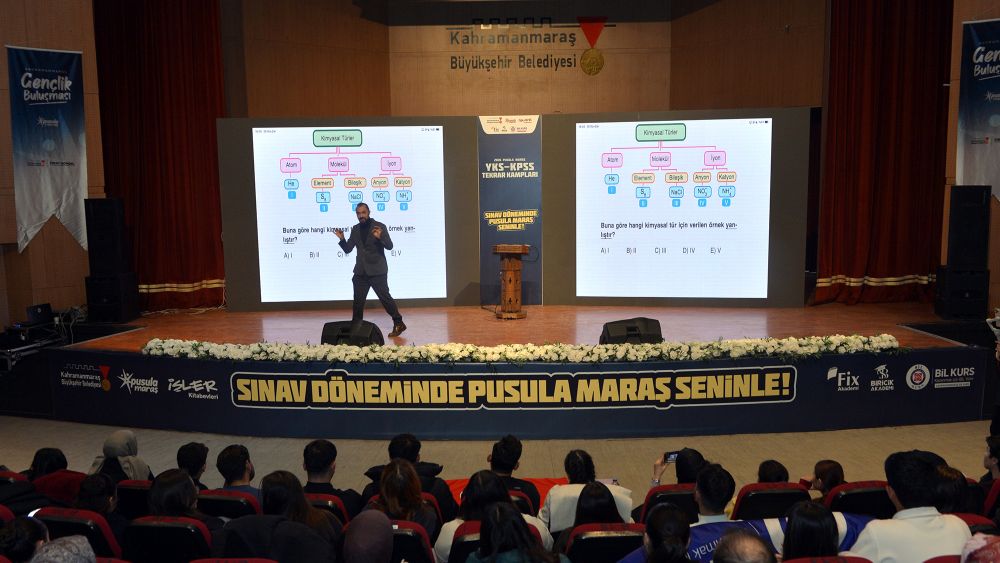 Kahramanmaraş Büyükşehir Belediyesinin üniversiteye hazırlanan gençler için düzenlediği YKS Kampı, üçüncü gününde fizik ve kimya dersleriyle devam etti. Mehmet Akif Ersoy Kültür Merkezi’nde gerçekleştirilen programda, alanında tanınan eğitimciler Yılmaz Kartal ve Mehmet Erdem gençlerle bir araya geldi.